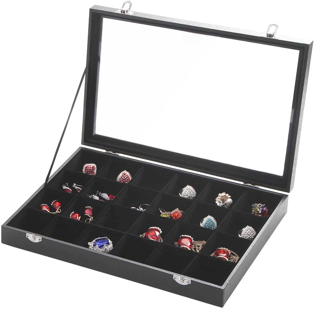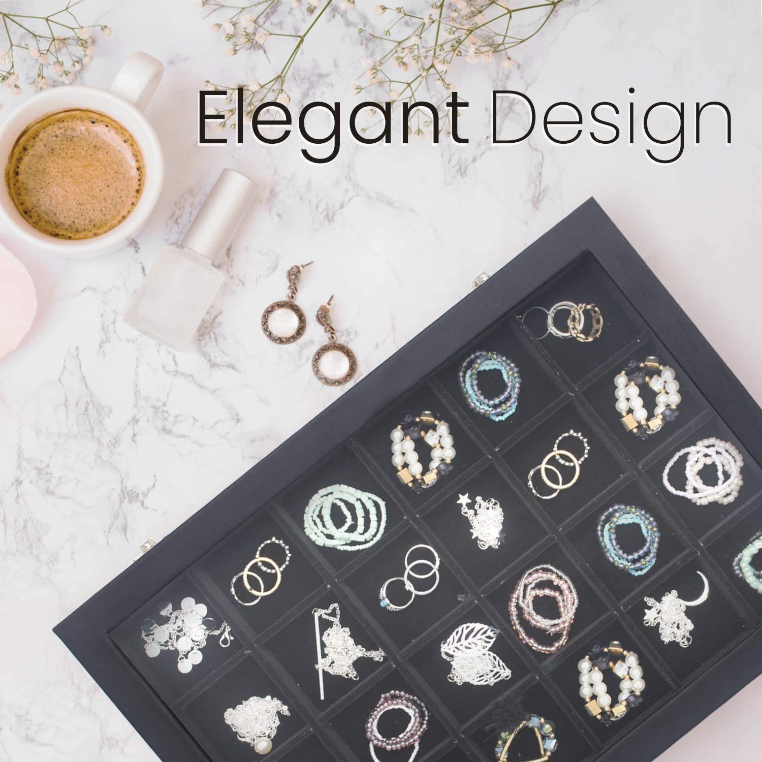 KriShyam® Removable 24 Grid Jewelry Boxes Stackers Jewelry Display Case Clear Top New Velvet material with Lock (24 Grid Box Black)35 x 24 x 5cm