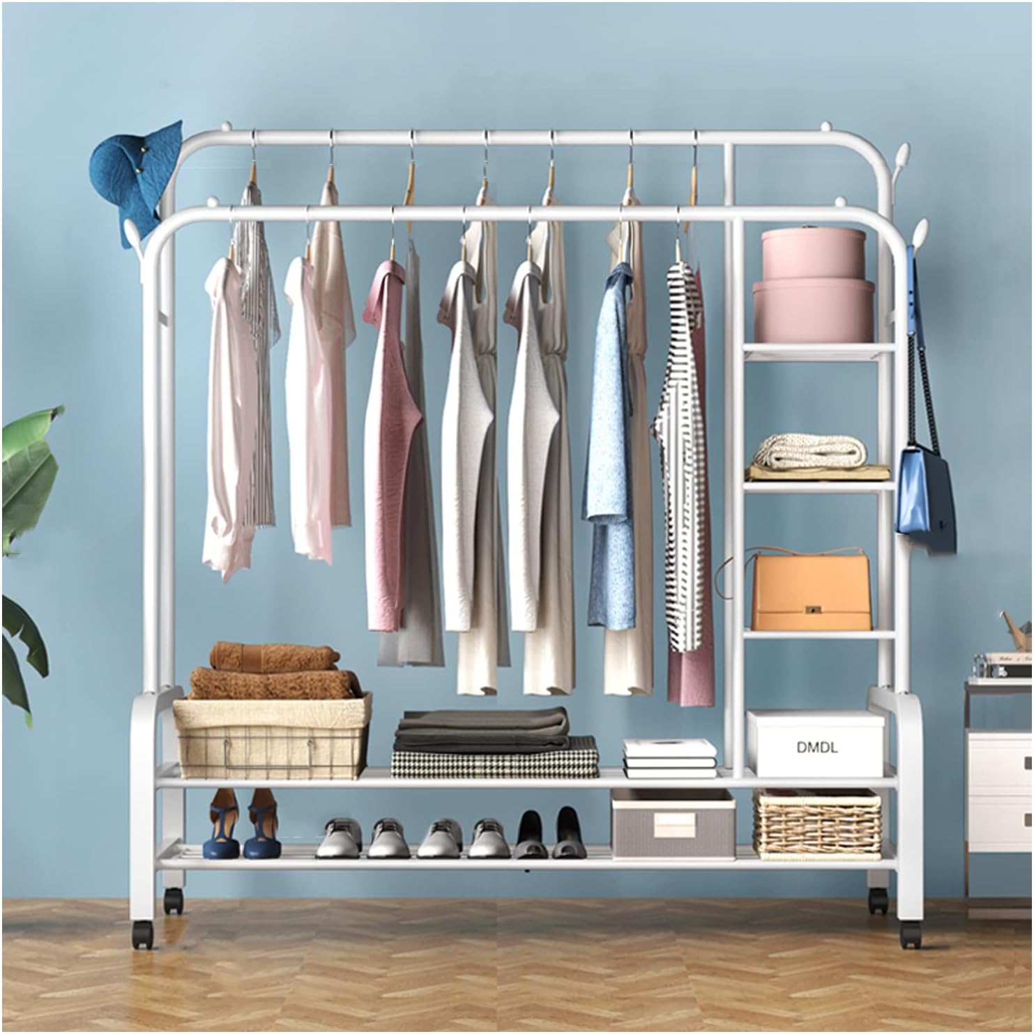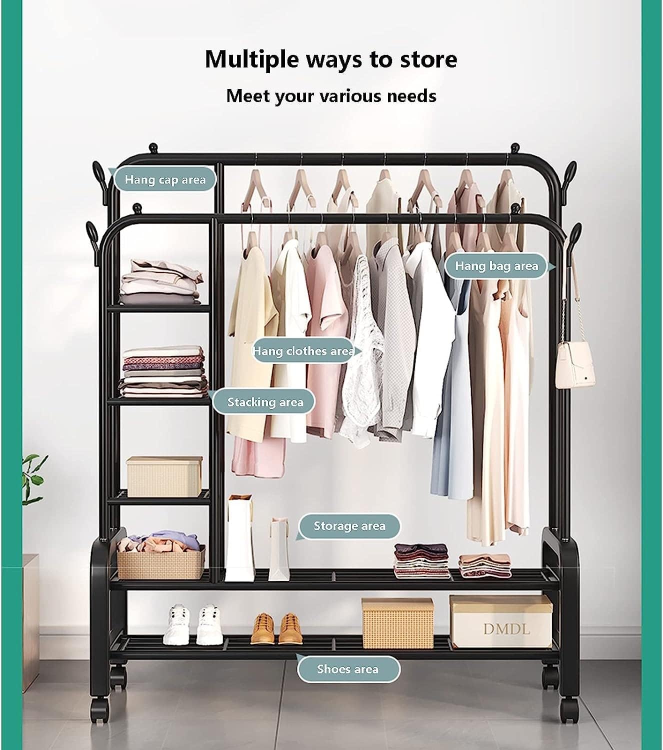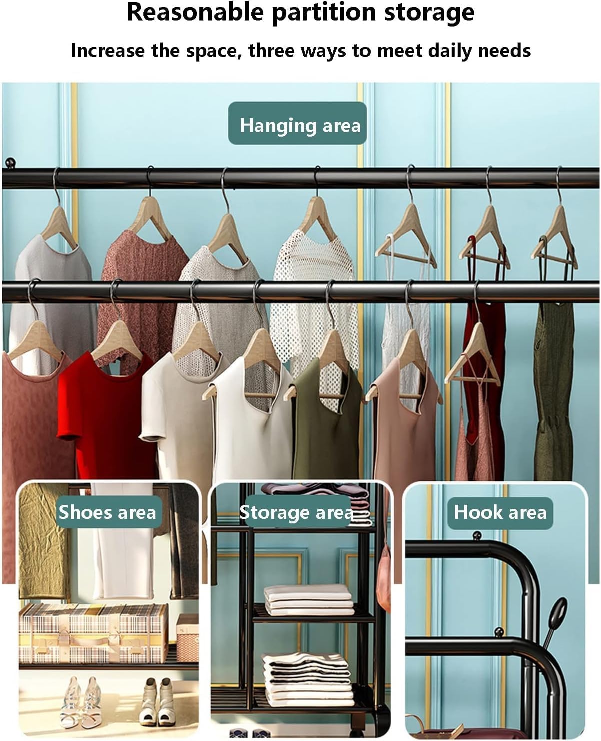 Krishyam® Double Rods Portable Garment Rack Wide Clothes Rail,Metal Clothes Rack with 2 Hanging Rails, 4 Hooks, 4 Side Shelves, and 2 Down Shelves, for Storing Shoes and Clothes