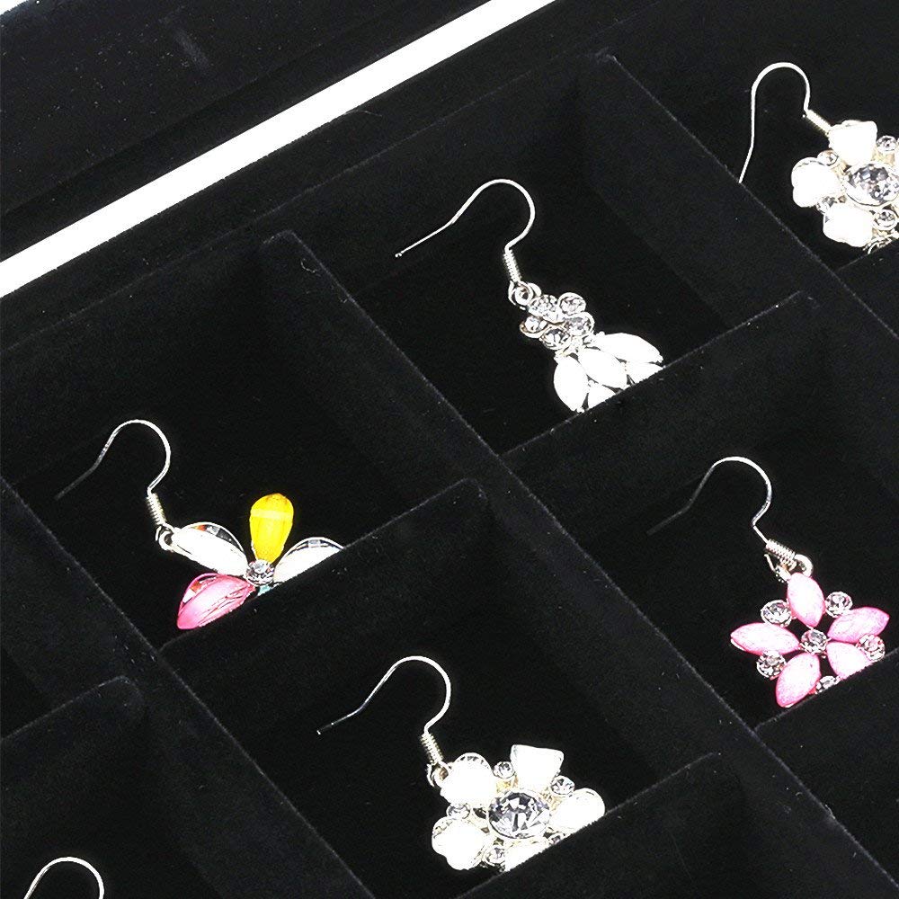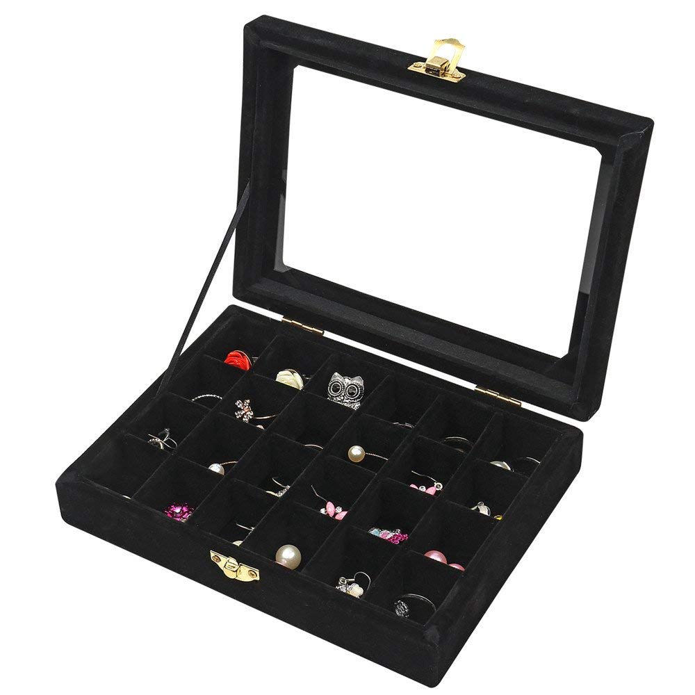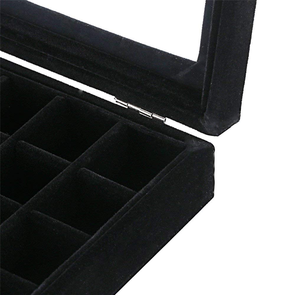 KriShyam® Earring Storage Case 24 Compartments Ring Velvet Display Case Box Earring Ring Organizer Velvet Jewelry Tray Cufflink Storage Showcase with Clear Glass Lid (Black)
