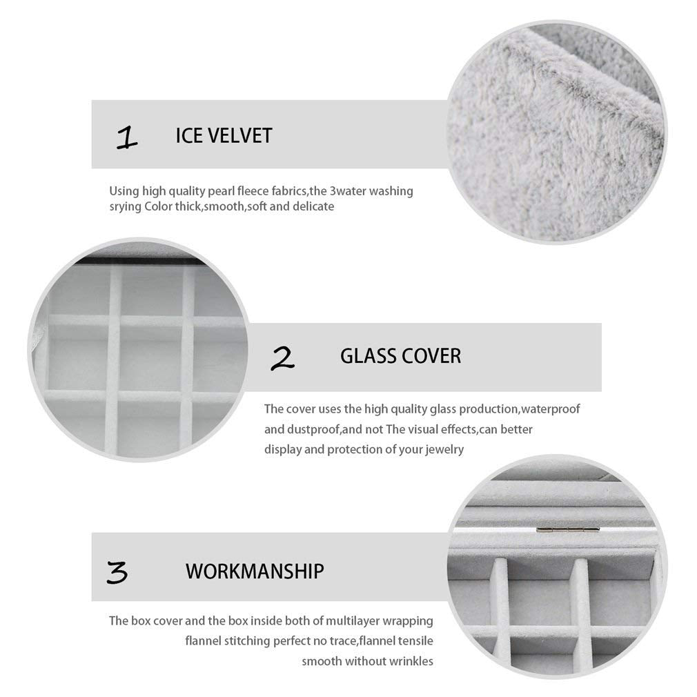 Earring Storage Case 24 Compartments Ring Velvet Display Case Box Earring Ring Organizer Velvet Jewelry Tray Cufflink Storage Showcase with Clear Glass Lid( Grey) Features: High-quality velvet fabric jewelry box with attractive appearance,simple structure,fine workmanship, and sturdy construction This elegant jewelry case allows you to show your jewelry while protecting them away from dust, fingerprints, scratches and thieves Clear glass top gives you a open view and you can find your favorite treasure in seconds with this unique jewelry box Ideal for home jewelry storage and decoration, and a wonderful gift idea Stackable,you could order several pieces of trays to stack and meet your different storage needs Seller's Tips: Perfect For Gift Giving.